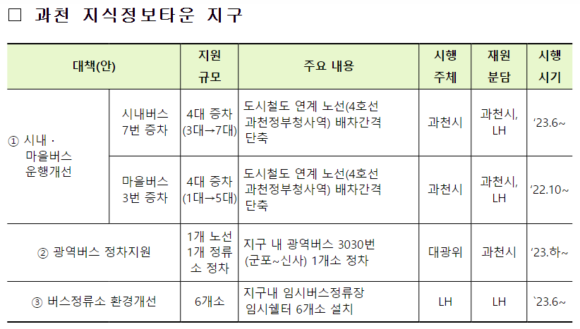 이에 대광위는 인근 도시철도역인 4호선 정부과천청사역을 운행하는 시내버스 7번과 마을버스 3번을 각 4대씩 증차해 도시철도와의 접근성을 개선하고, 군포시에서 신사역 간을 운행하는 광역버스 3030번을 지식정보타운지구 내 정류장에 추가로 정차하게 하여 지구 주민의 강남 방면 접근성도 높일 예정이다.