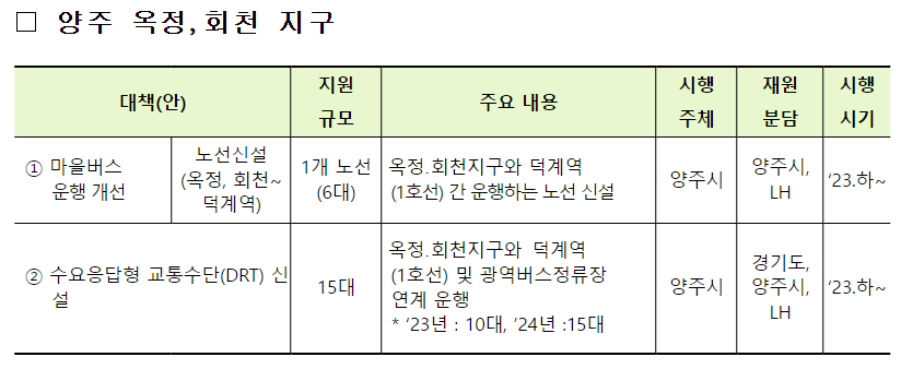 양주 옥정·회천 지구는 계획인구가 18만여 명, 개발면적 1118만㎡의 대규모 사업지구로서 급격한 인구 증가에 따라 지속적으로 광역교통 수요가 증가하는 지역 중 하나이다. 이에 대광위는 해당 지구와 주요 거점인 인근 철도역과 광역버스 정류장과의 연계 교통수단을 확충해 입주민들의 교통 편의를 증진할 수 있는 대책을 마련했다.