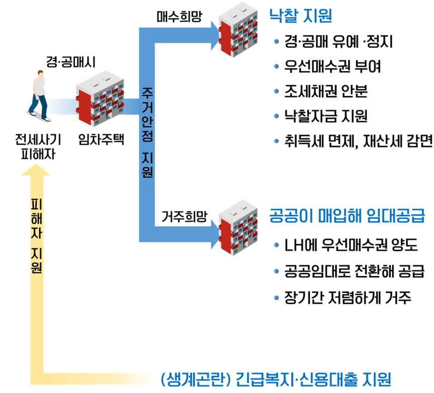 만약 경·공매가 이미 완료된 임차인이라도 전세사기 피해자로 인정되었다면 공공임대 입주와 긴급복지·신용대출 지원이 이루어진다.