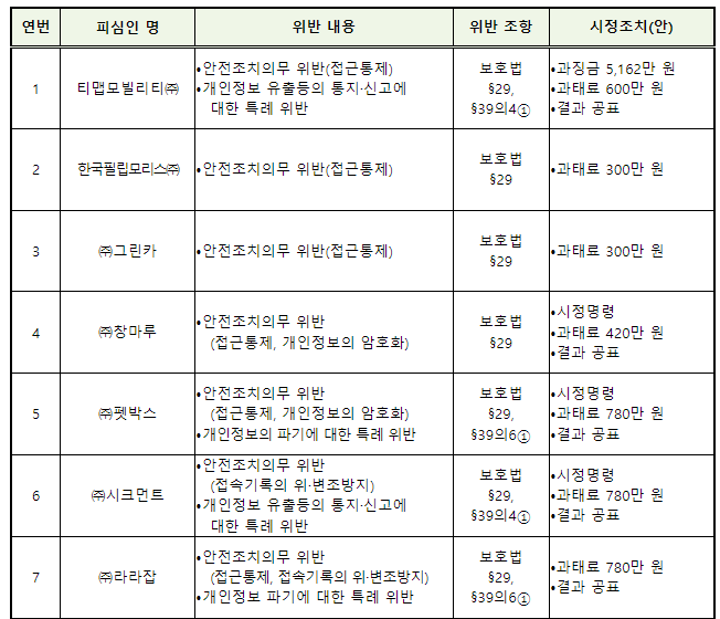 여기에 창마루·펫박스·시크먼트·라라잡·마케팅이즈 등 5개 사업자는 해커의 공격에 의해 개인정보가 유출되었으며, 개인정보위는 이들 모두 안전조치의무를 소홀히 한 사실을 확인하고 시정명령과 과태료 등의 제재 처분을 부과했다.