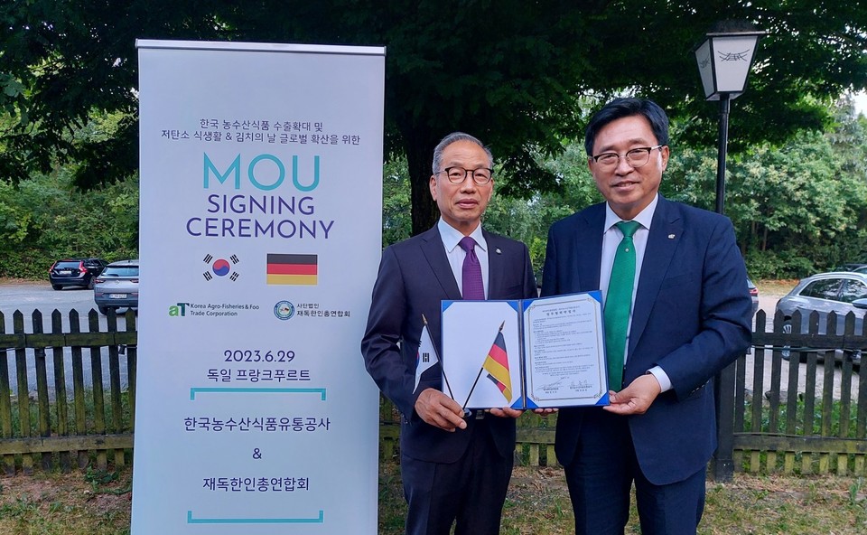한국농수산식품유통공사(aT)는 최근 독일 프랑크푸르트에서 사단법인 재독한인총연합회와 함께 유럽지역 저탄소 식생활 확산과 글로벌 김치의 날 제정 협력을 위한 업무협약을 체결했다고 밝혔다.