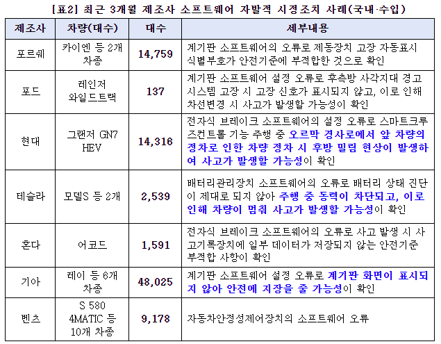 여기에 소비자주권시민회의는 최근 국토교통부 자동차리콜센터의 리콜 현황을 조사한 결과 국내·수입 완성차 업체의 SW 결함에 대한 시정조치가 최근 3개월간 7차례(23개 차종)에 이르는 것으로 확인했다고 밝혔다. 특히 테슬라의 모델S 등 일부 차종은 배터리관리장치 SW의 오류로 배터리 상태 진단이 제대로 되지 않는 현상이 발생하는 것으로 나타났는데, 이는 주행 중 동력이 차단돼 차량이 멈추는 위험한 상황을 초래할 수 있다.