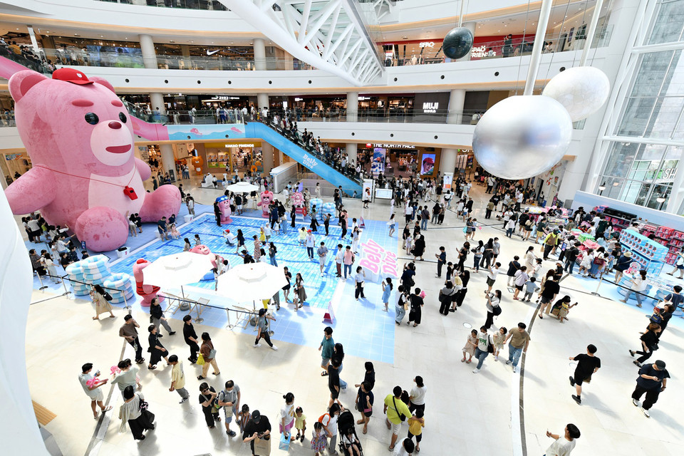 롯데홈쇼핑은 오는 27일까지 서울 영등포 타임스퀘어 아트리움광장에서 ‘벨리 다이브, 비 케어풀(Belly Dive, B-Carepool)’ 전시를 진행하고 있다.