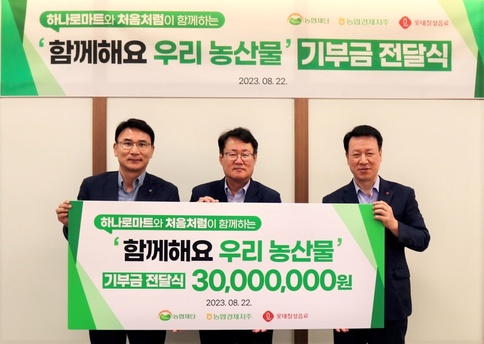 농협경제지주는 지난 22일 롯데칠성음료, 농협재단과 함께 ‘함께해요 우리 농산물! 캠페인’ 기부금 전달식을 개최했다고 밝혔다.