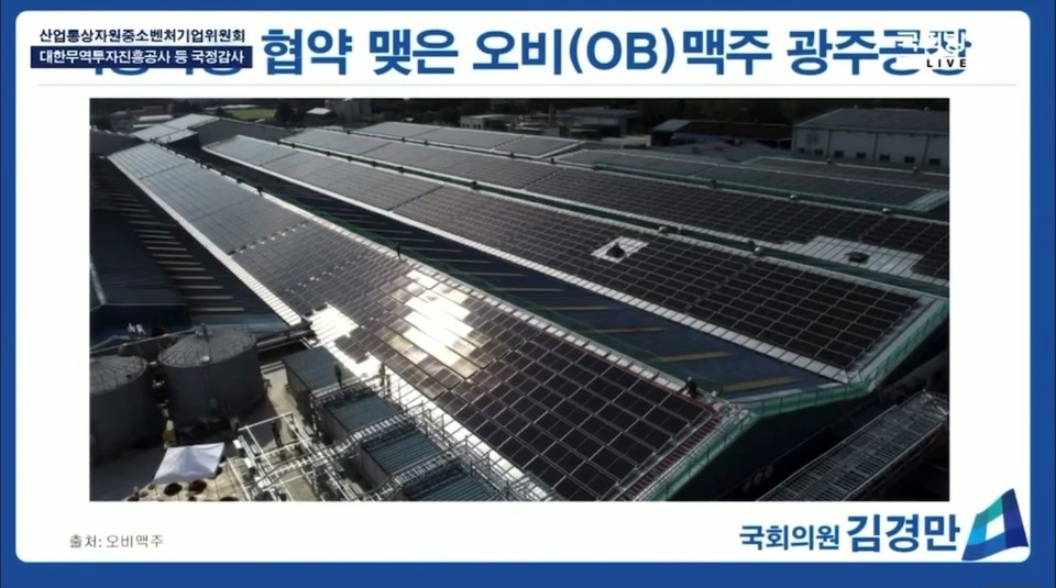 김경만 더불어민주당 의원은 지난 13일 열린 산자위 국정감사에서 오비맥주 광주공장이 공장지붕에 태양광 발전시설을 구축하고 자가 발전한 재생에너지를 직접 사용하는 사례를 민간 주도 탄소감축 활동의 모범사례로 소개했다.