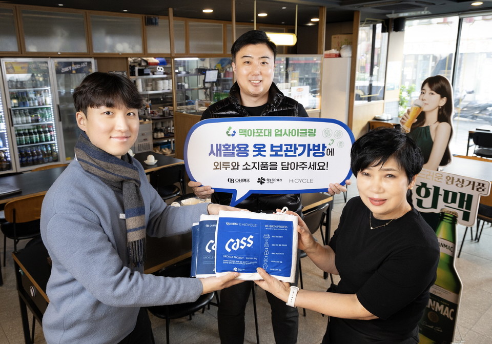 지난해 오비맥주는 주류업계 최초로 맥주 생산 후 버려지는 맥아포대를 업사이클링하고, 고깃집을 운영하는 업주들에게 실질적 도움을 주기 위해 외투 보관가방을 제작·배포한 바 있다.