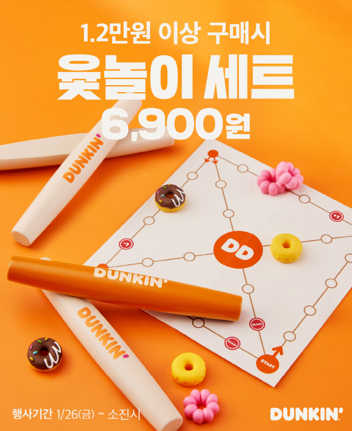 던킨은 ‘던킨 윷놀이 세트’ 출시를 기념해 사전 예약 프로모션을 실시한다. 오는 25일까지 해피오더 애플리케이션에서 사전 예약하면 2000원 할인 혜택이 적용된 4900원에 구매할 수 있다.
