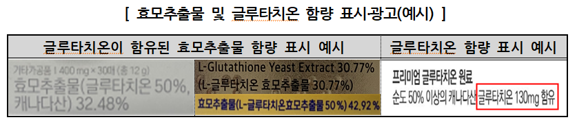 따라서 제품에는 원재료로 사용한 효모추출물과 그 일부인 글루타치온 함량의 비율(%)이 표시되어 있다. 그러나 조사결과, 7개 제품은 글루타치온 함량에 대해서 구체적인 수치(mg) 등을 제품 또는 온라인 쇼핑몰에 제공하고 있었고 그중 5개 제품의 실제 글루타치온 함량은 표시 함량의 절반에 불과했다. 제공된 글루타치온 함량을 기준으로 소비자가 제품을 선택할 시 혼동이 생길 수 있었다.