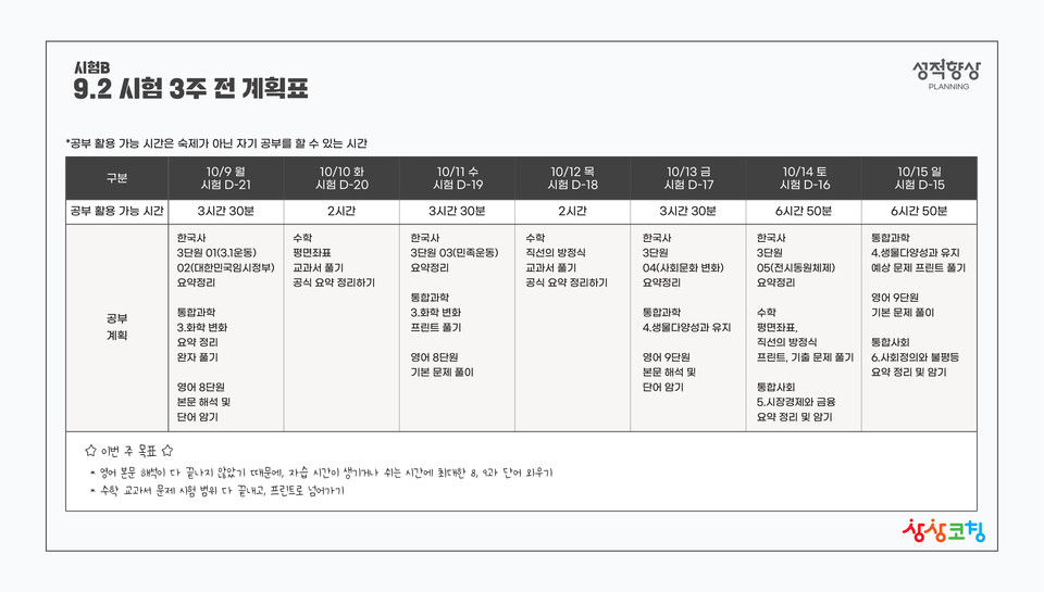 플래닝이 접목된 상상코칭은 과목코칭을 기본으로 ▲공부의 이유와 목표를 세우고 ▲학습계획에 중요성을 알며 ▲자기주도 TEST를 통해 자기주도력을 올리고 ▲시험과 방학에 맞는 학습플래닝을 통해 나의 공부시간을 효율적으로 활용하는 서비스가 제공된다.