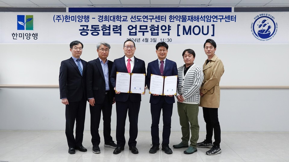 한미양행은 지난 3일 경희대학교 선도연구센터인 한약물재해석 암연구센터와 ‘천연물 기반의 한약물 재해석 소재 개발 및 건강기능식품 사업화’를 위한 MOU를 체결했다고 밝혔다.