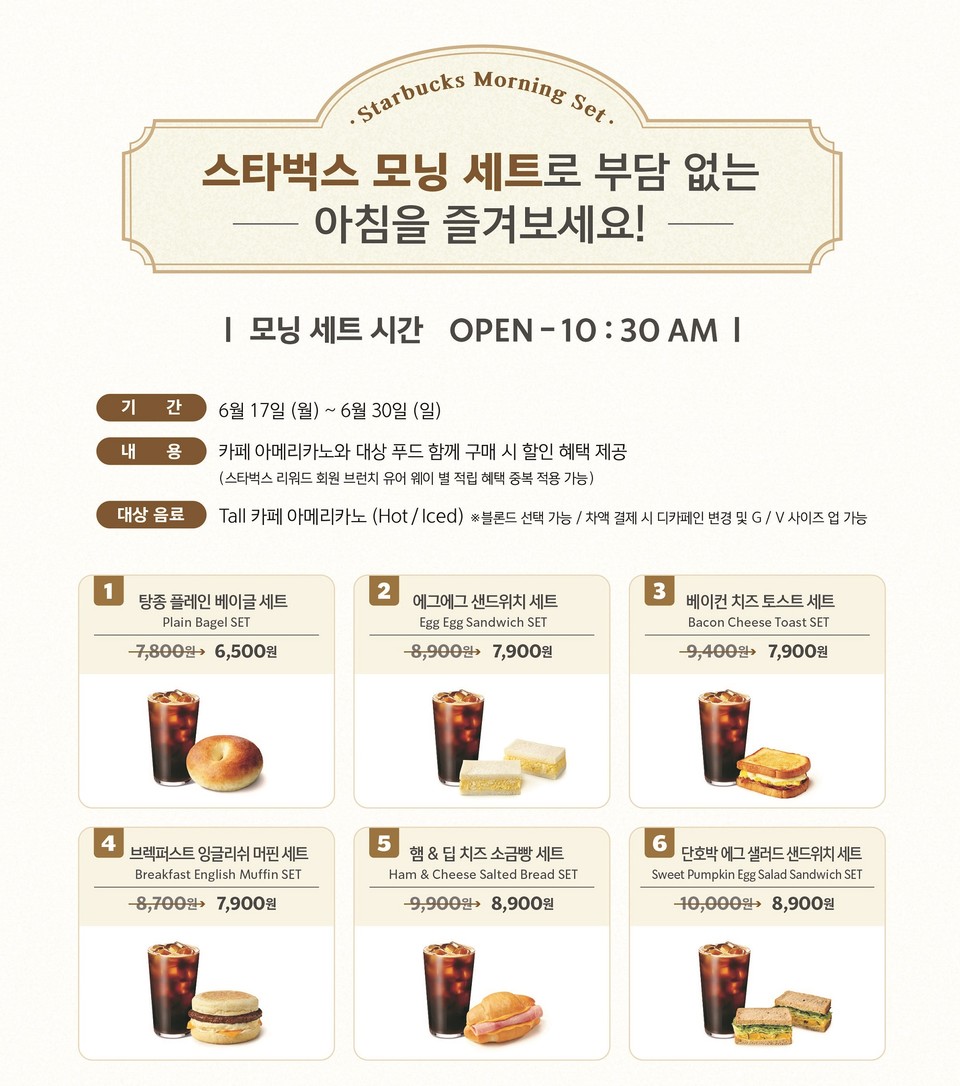 모닝 세트 이벤트 대상 푸드는 ▲탕종 플레인 베이글 ▲햄 & 딥 치즈 소금빵 ▲에그에그 샌드위치 ▲단호박 에그 샐러드 샌드위치 ▲베이컨 치즈 토스트 ▲브렉퍼스트 잉글리쉬 머핀 등 6종이며 아침식사 대용으로 인기가 높은 상품으로 구성됐다.