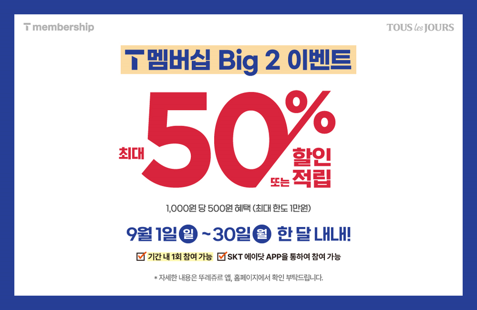 SKT T멤버십 고객 및 SKT 에이닷 고객이라면 누구나 최대 50%의 혜택을 제공하는 프로모션으로, 기간 내 1회, 구매 금액 1만 원 이내에서 1천 원 당 500원 할인 또는 적립이 가능하며,결제 시 에이닷 앱 내 ‘Big 2매직 바코드’를 제시하면 된다.