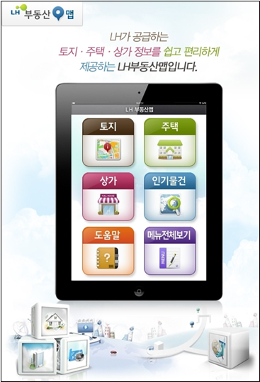 ‘LH 부동산 맵’은 지도와 항공사진, 주택 실거래가와 공시지가 등 주변정보까지 서비스하며, 인터넷 환경이 되는 곳이면 언제 어디서든 누구나 현장감 있게 접할 수 있고 이동 중에도 태블릿 PC를 통해 관심매물을 조회할 수 있는 기능을 갖췄다.