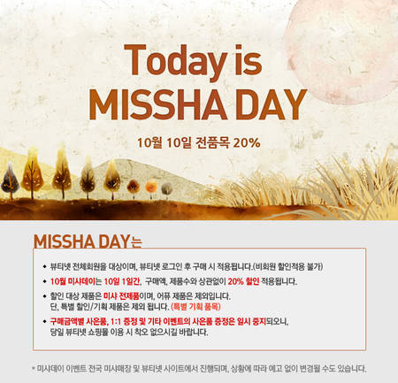 [소비자경제=방미선 기자] 10일, 단 하루동안 미샤가 전품목 20%할인 ‘미샤데이’ 이벤트를 진행한다.