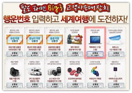 빅3 고객사은대잔치는 라면 제품에 들어 있는 스크래치 카드 인증번호를 활용하여 ‘남자라면 세계여행에 도전하라!’, ‘앵그리꼬꼬면 맛의 비법을 찾아라!’ 등에 응모하는 행사로, 특히 ‘남자라면 세계여행에 도전하라!’에벤트에는 총 8만 여명의 참가자가 몰리기도 했다.