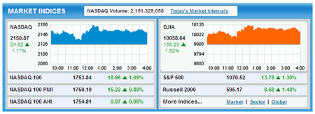9일(현지시각) 미국 뉴욕증권거래소에서 다우지수는 150.25포인트(1.52%) 상승한 10058.64로 장을 마감했으며, 나스닥지수는 24.82(1.2%) 상승한 2150.87으로, 스탠더드앤드푸어스(S&P) 500 지수는 13.78(1.3%) 상승한 1070.52으로 거래를 마쳤다.