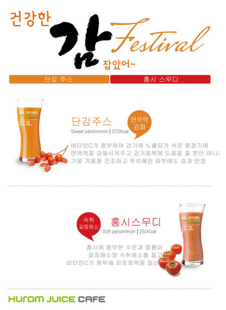 휴롬팜이 단감 주스와 홍시 스무디를 한 달간 5000원에 만나 볼 수 있는 ‘건강한 감 잡았어 페스티벌’을 진행한다.