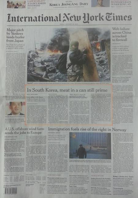 국내 대표 캔햄 브랜드 스팸이 뉴욕타임즈(The New York Times) 국제판인 인터내셔널 뉴욕타임즈(International New York Times) 지난 24일자 1면과 3면에 걸쳐 대대적으로 보도됐다.