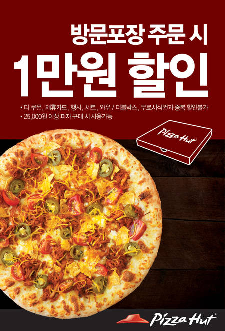 피자헛 방문포장 1만원 할인 이벤트는 전화, 온라인, 모바일, 매장 주문을 통해 전국 모든 피자헛 매장에서 이용 가능하나 타 할인 쿠폰이나 세트 중복 할인, 와우박스와 더블박스 이용 시에는 불가하다.