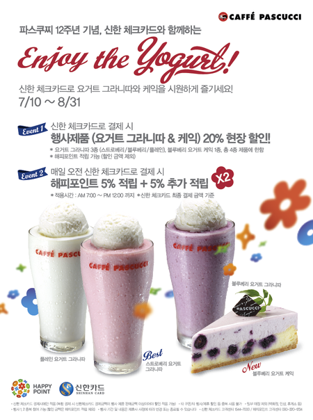 31일까지 신한체크카드로 결제시 요거트 그라니따 3종과 요거트 케이크를 20% 할인된 가격에 판매하며, 해피포인트 적립 혜택도 제공한다.
