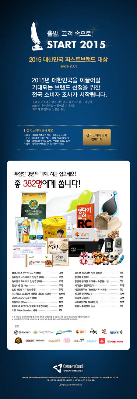 [소비자경제=장은정 기자]‘2015 대한민국 퍼스트브랜드 대상’을 선정하는 전국 소비자조사가 17일부터 26일까지 열흘간 진행된다.