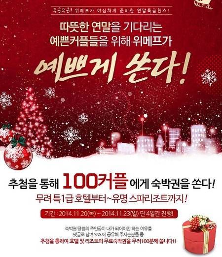 이밖에도 위메프는 따뜻한 연말을 기다리는 커플들을 위해 롯데호텔 서울, 메이필드 호텔, 동강시스타 등 특1급 호텔부터 유명 스파 리조트까지 무료 숙박권을 제공하는 ‘예쁘게 쏜다’ 이벤트도 진행한다.