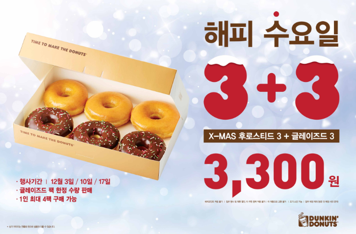 이번 해피 수요일 프로모션은 던킨도너츠가 12월 새롭게 선보인 ‘크리스마스 후로스티드’ 3개 구매 시 ‘글레이즈드’ 3개를 추가 증정하는 이벤트로, 2가지 맛의 도넛 6개 팩을 권장소비자가격 3300원에 만나볼 수 있다.