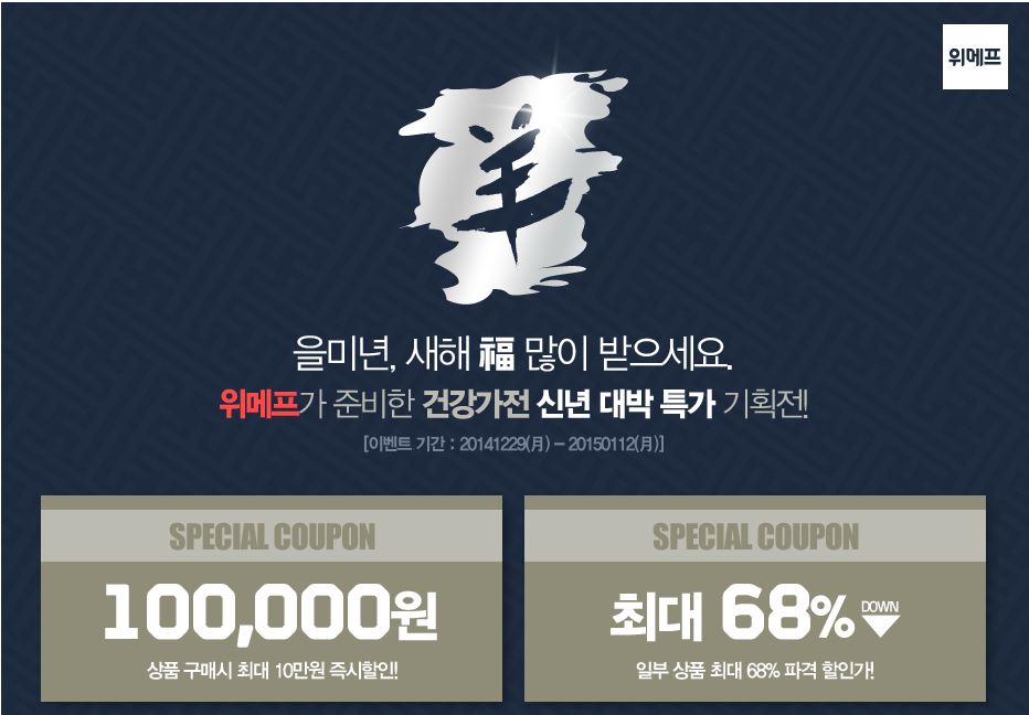 [소비자경제=고유진 기자] 소셜커머스 위메프가 새해를 맞아 오는 1월 12일까지 건강가전 기획전을 개최한다고 31일 밝혔다.