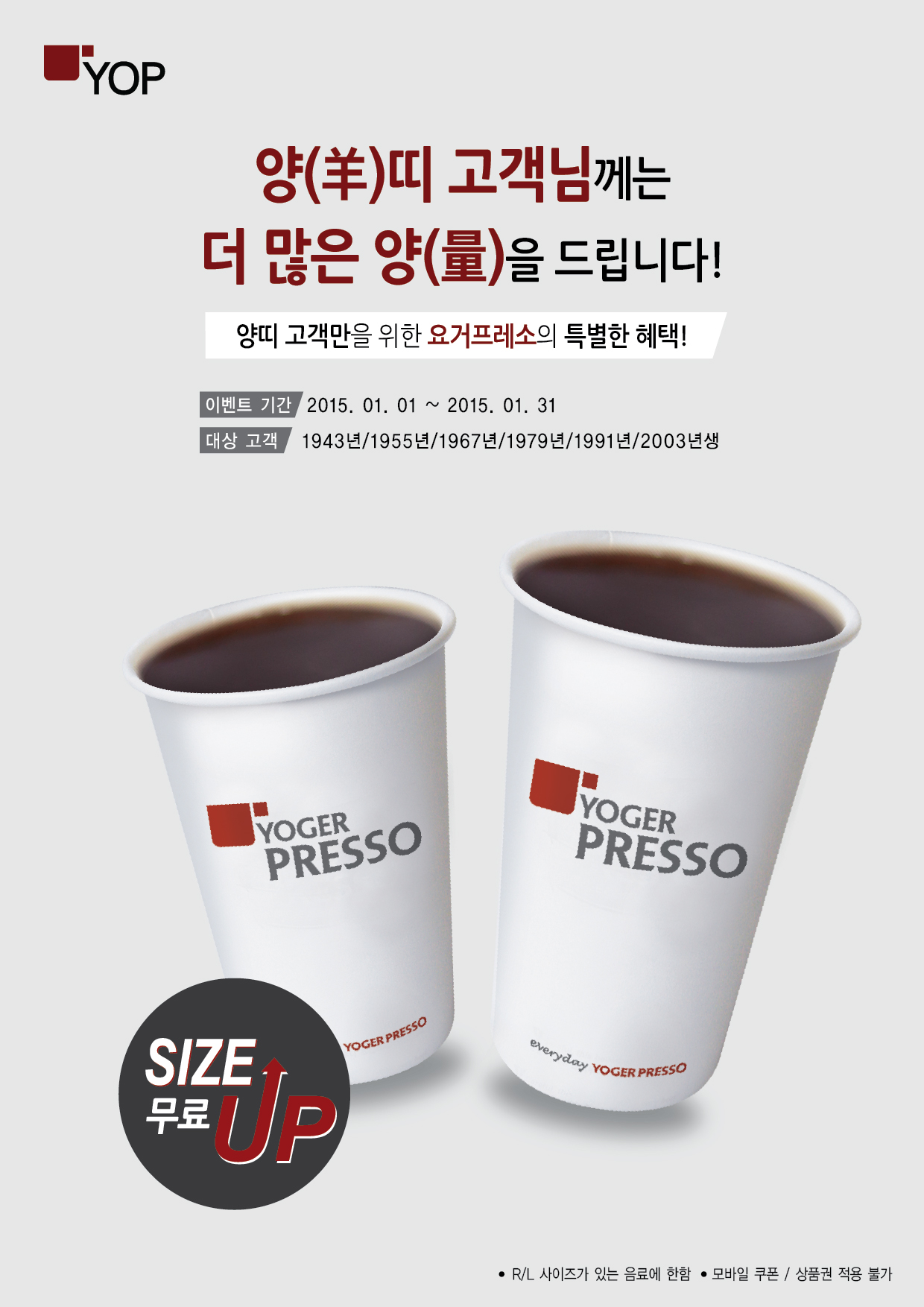 [소비자경제=고유진 기자] 커피전문점 요거프레소가 2015년 ‘양’의 해를 맞아 양띠 고객을 대상으로 무료 음료 사이즈 업 이벤트를 진행 한다고 31일 밝혔다.