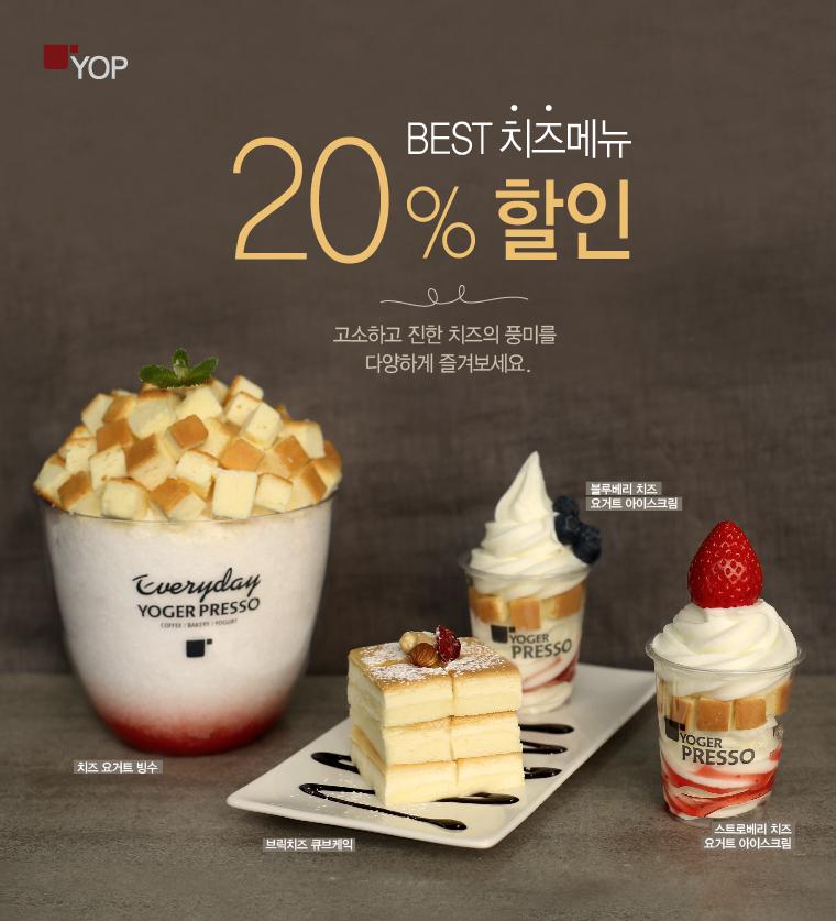 커피와 베스트 조합을 자랑하는 브릭치즈 큐브케익은 3200원, 통으로 듬뿍 올려진 수플레 치즈 케익을 맛볼 수 있는 치즈 요거트 빙수는 77200원, 블루베리 치즈 요거트 아이스크림과 스트로베리 치즈 요거트 아이스크림도 각 20% 할인된 3600원에 할인 판매 된다.