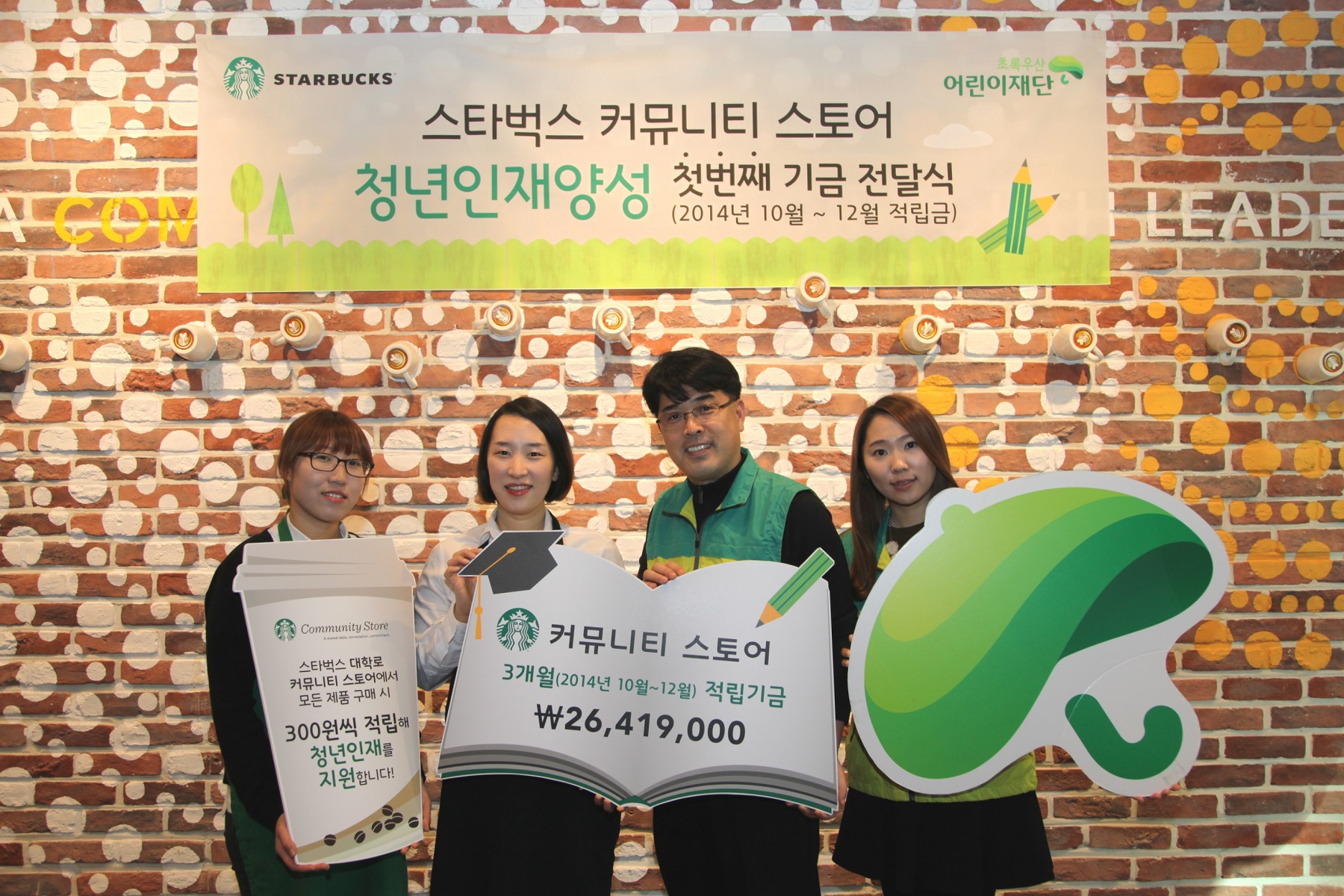 이 날 스타벅스는 ‘커뮤니티 스토어’에서 작년 10월 오픈 이후 12월까지 3개월간 적립한 기금 2641만9000원을 초록우산 어린이재단에 전달했다.