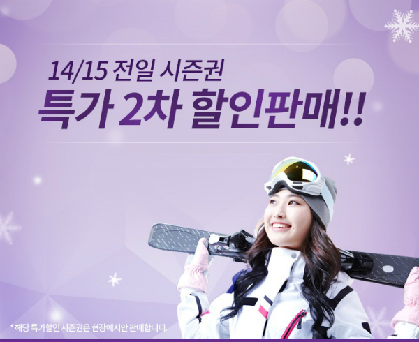 올 시즌 들어 두 번째로 특가 할인 판매되는 ‘14/15 전일 시즌권’은 대인, 소인 구분 없이 정상가격에서 50% 할인된 25만원에 판매된다.