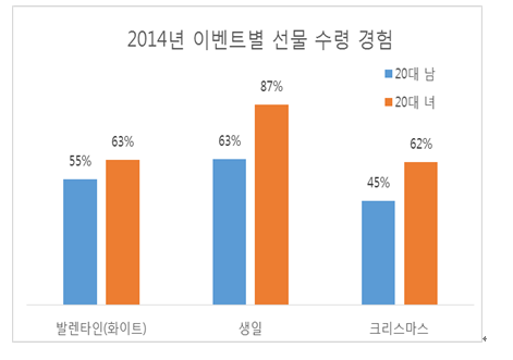 이어 생일과 크리스마스에는 평균적으로 17만원을 소비하는 반면, 발렌타인·화이트데이에는 40% 이상 저렴한 10만원을 소비함에도 상대적으로 높은 만족도를 나타냈다.