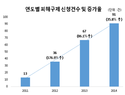대학생 대상 인터넷교육서비스 피해 건수는 2011년 13건에서 2012년 36건, 2013년 67건, 2014년 91건으로 해마다 증가하고 있는 것으로 나타났다.