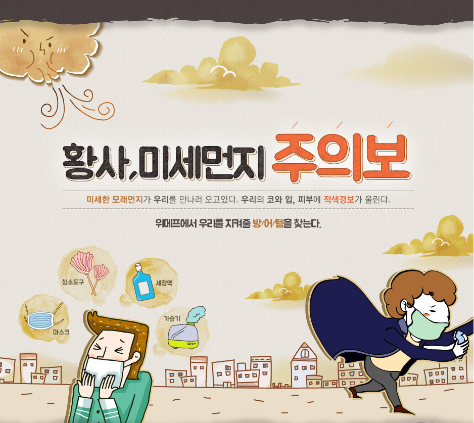 한편, 위메프는 3월 대형 황사에 대비해 위생용품과 청소용품 등 다양한 황사 관련 상품들을 최대 50% 할인 판매하는 ‘황사, 미세먼지 주의보’ 기획전을 진행 중이다.