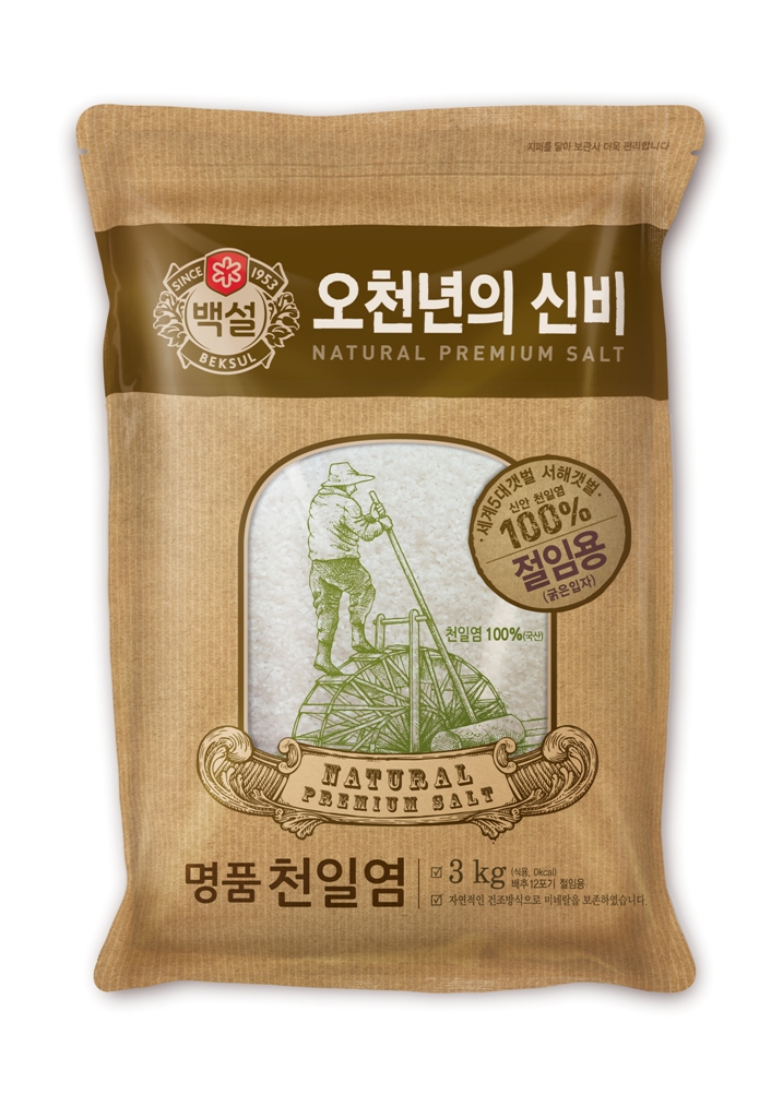 CJ제일제당은 백설 오천년의 신비 명품 천일염은 육지에서 약 40km 떨어진 전라남도 신안군 청정해역에서 생산되며, 간수를 빼는 과정에서 기계를 사용해 강제 탈수하지 않고 자연건조한 제품으로, 특허 받은 자연건조 공법과 6단계의 까다로운 공정을 거쳐 미네랄 손실과 쓴 맛을 최소화한 것이 특징이라고 소개했다.