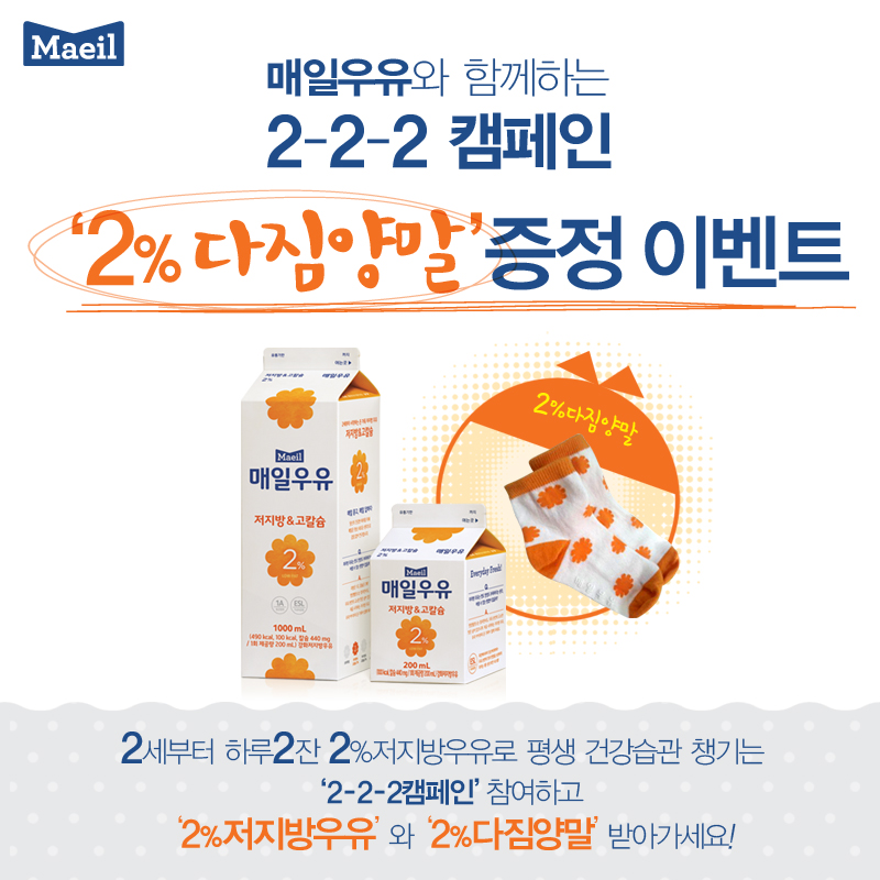 매일우유에 따르면 ‘2% 다짐양말 증정 이벤트’는 하루 2잔, 2% 저지방 우유를 마시는 ‘2-2-2 캠페인’에 참여하겠다는 내용의 댓글을 남기면 추첨을 통해 222명에게 ‘저지방&고칼슘 2%’ 우유와 ‘2% 다짐양말’을 증정하는 이벤트이다.