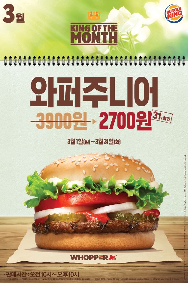 버거킹에 따르면 이번 와퍼주니어 특별 할인 행사는 버거킹이 매달 진행하는 ‘킹 오브 더 먼스(King of the month)’ 프로모션의 일환으로, 그 달의 대표 메뉴를 선정하여 소비자들이 보다 부담 없는 가격으로 즐길 수 있도록 하고 있다.