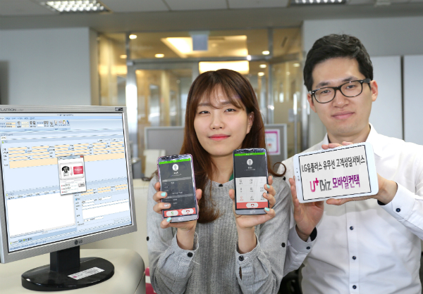 ‘U+Biz 모바일컨택’은 기업의 고객관계관리(CRM)서버를 모바일 애플리케이션과 연동해 고객정보 조회, 고객 상담 메모, 가입자간 무료통화 등을 스마트폰으로 활용할 수 있는 서비스다.
