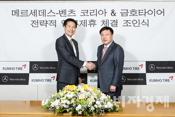 이날 금호타이어는 서울 중구의 메르세데스-벤츠 코리아 본사에서 전략적 업무제휴 체결 조인식을 갖고, 향후 RE(교체용) 타이어 공급과 관련해 업무를 공조하기로 했다.