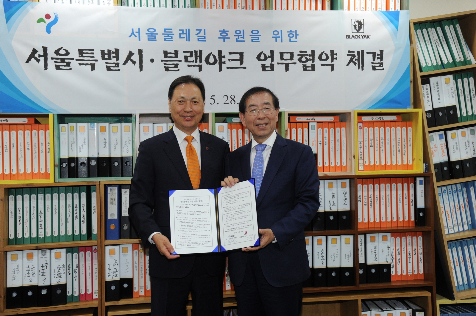 서울시청 시장실에서 진행된 이번 협약식에는 강태선 블랙야크 회장과 박원순 서울시장을 비롯한 관계자들이 참석해 자리를 빛냈다. 블랙야크는 이날 “오는 2017년까지 20억 원 상당 규모의 지원을 통해 서울둘레길 이용객들이 양질의 서비스를 제공받을 수 있도록 노력할 것”이라고 밝혔다.