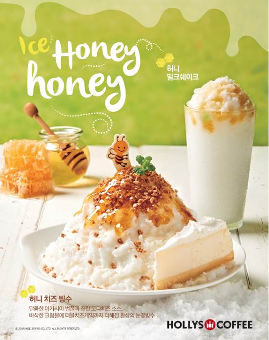 이번 ‘허니치즈빙수’는 담백한 우유얼음에 고다치즈 베이스, 달콤한 꿀, 더블치즈케익을 올려 눈꽃빙수의 퀄리티를 높였다. 꿀벌 모양의 초콜릿 조각과 애플민트로 장식해 비주얼까지 강화했다. 가격은 1만1500원이다.