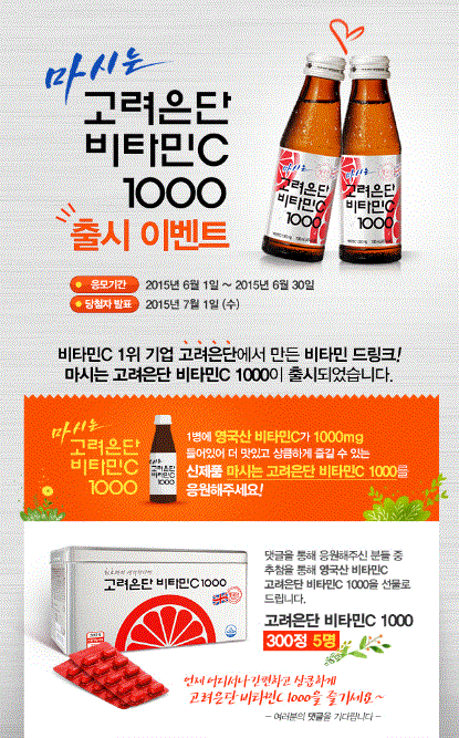 신제품 ‘마시는 고려은단 비타민C 1000’을 응원하는 글을 고려은단 홈페이지 이벤트란에 댓글로 남기면 추첨을 통해 ‘고려은단 비타민C 1000’ 300정을 총 5명에게 증정한다.