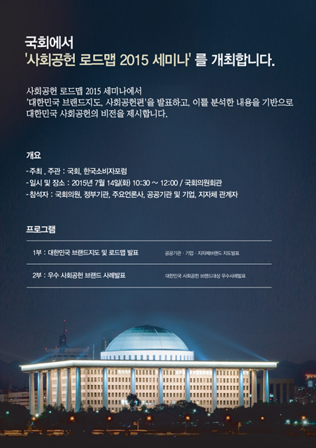 [소비자경제=엄수진 기자] 국회사회공헌포럼과 한국소비자포럼은 오는 14일 국회 헌정기념관 대강당에서 ‘사회공헌 로드맵 2015’ 세미나를 개최한다.