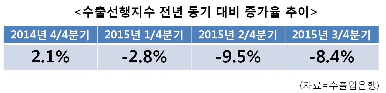 수은이 19일 발표한 ‘2015년 2분기 수출 실적 평가 및 3분기 전망’에 따르면 향후 수출경기 판단의 기준이 되는 수출선행지수(수출증감 정도를 예측할 수 있도록 만든 지수)가 4분기만에 반등하면서 수출 경기 하락세가 진정돼 수출증가율은 전기(6.9%)보다 하락폭이 축소된 3% 내외일 것으로 내다봤다.
