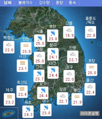 이날 오전 5시 기온은 서울 24.9도, 인천 23.9도, 수원 24도, 춘천 21.2도, 강릉 16.1도, 대전 22.7도, 전주 23.7, 광주 24.1도, 목포 21.7도, 대구 19.5도, 부산 21.3도, 울산 19.9도, 창원 20.9도, 제주 22.3도다