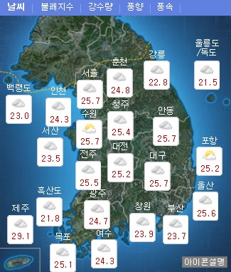 일부 내륙지역에는 밤사이 기온이 25도 이상 유지돼 열대야 현상을 보이는 곳도 있겠다. 최고기온은 25∼30도로 전날보다 조금 낮겠다. 기상청은 23∼24일 모든 해상에서 안개가 짙게 끼는 곳이 있어 항해나 조업하는 선박에 주의를 당부했다.
