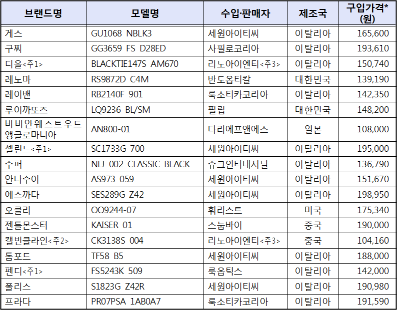 선글라스의 가격은 해외직구보다 국내 온라인 가격이 대체로 더 저렴한 것으로 나타났다. 시험대상 선글라스 18종 중 국내 온라인 판매가와 비교 가능한 6종 모델의 해외직구 가격을 조사한 결과, 국내 온라인 판매가격이 해외직구가격보다 평균 45.2% 저렴한 것으로 나타났다.