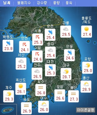 낮 최고기온은 27도에서 34도로 전날보다는 낮겠다.