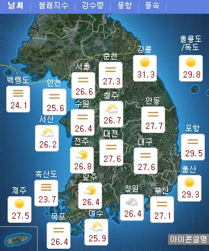 낮 최고기온은 30도에서 36도로 전날과 비슷하겠다. 대구·강릉 36도, 울산·제주 35도, 서울 32도로 전망된다.